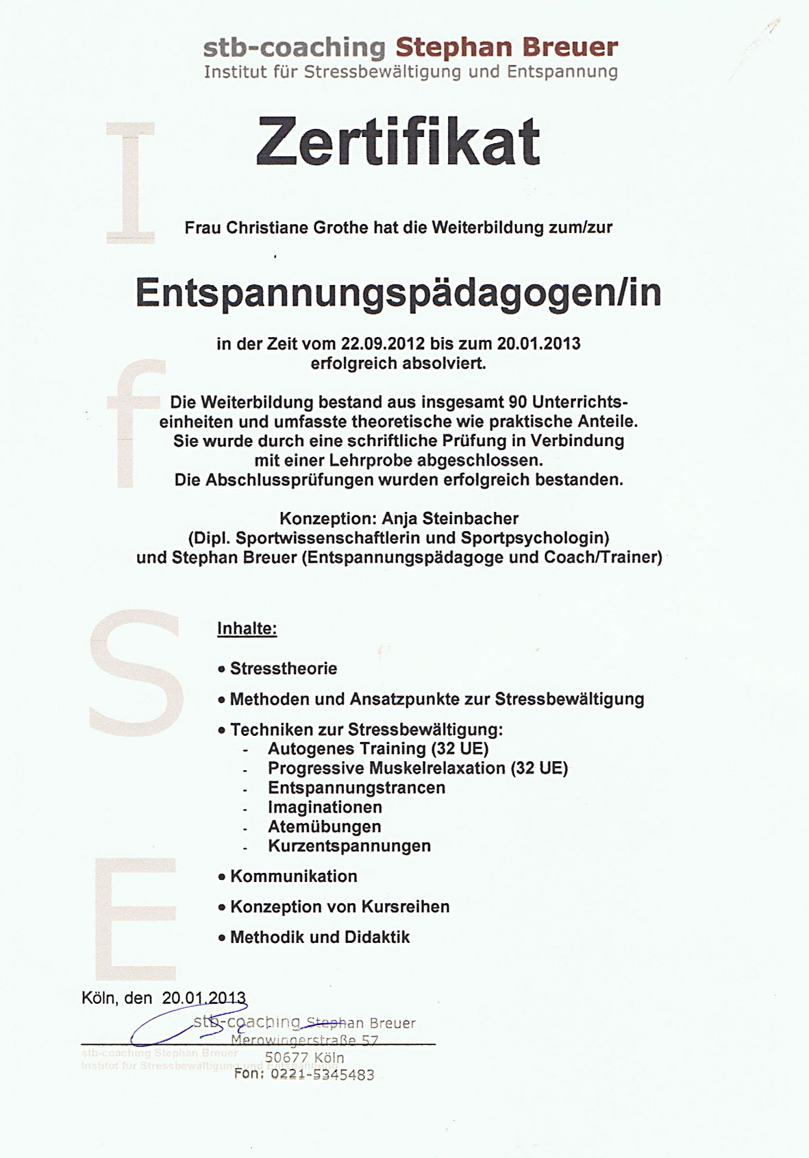 Bei der Ausbildung zur Psycho­logischen Beraterin bei Psychologin und Heilpraktikerin Dr. Susanne Blome in Hattingen wurde mir klar, wie wichtig das Thema Entspannung für viele Bereiche in unserem Leben ist. So absolvierte ich die Ausbildung zur Entspannungs­pädagogin beim Institut für Stressbewältigung und Entspannung Stefan Breuer in Köln, bei der ich unter anderem die Progressive Muskelentspannung nach Jacobson und das Autogene Training nach J.H. Schulz erlernte.